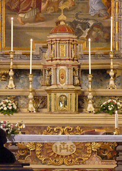 The Priest Approaches and Kisses the Altar: The altar is a symbol of Christ. In it are cut five crosses to recall the five wounds of Christ. The altar also represents the Church and has embedded in it the relics of her saints. The priest comes to the altar to celebrate the Sacrifice in the Church's name. Because of the glory surrounding the altar upon which the divine Sacrifice will be made, the kiss of the priest unites the Church to Christ, its Redeemer.